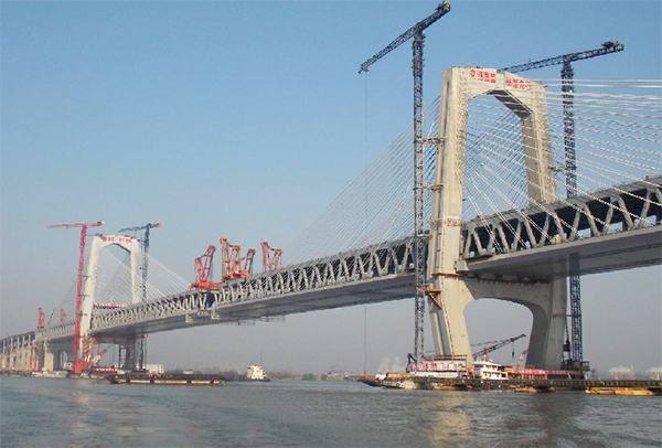 工程概況:商合杭鐵路位于河南、安徽和浙江三省境內(nèi)。線路起于河南省商丘,向南途經(jīng)安徽省亳州、阜陽、六安、淮南、合肥、、蕪湖、宣城,而后進入浙江省湖州至杭州,線路全長798km。商合杭鐵路在安徽省蕪湖市跨越長江,采用公鐵合建橋梁方案,公路在上、鐵路在下的分層布置設(shè)計。橋位位于既有蕪湖長江公鐵兩用大橋上游3.5km,蕪湖市弋磯山附近。蕪湖長江公鐵大橋跨江主橋設(shè)計采用(99.3+238+588+224+85.3)m雙塔雙索面高低塔鋼箱鋼桁組合梁斜拉橋,全長1234.6m。