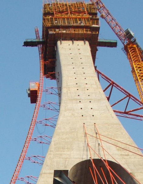 工程概況:黃河大橋總長3916米,主橋為雙塔中央索面斜拉橋,主塔高140米,采用寶瓶形鋼筋混凝土結(jié)構(gòu),主跨跨徑430米,采用鋼-混組合梁,是目前黃河上同類型橋梁中跨徑最大的橋梁。設(shè)計標(biāo)準(zhǔn)為雙向六車道高速公路,設(shè)計時速為120公里,是國高青蘭線泰東高速公路控制性工程。